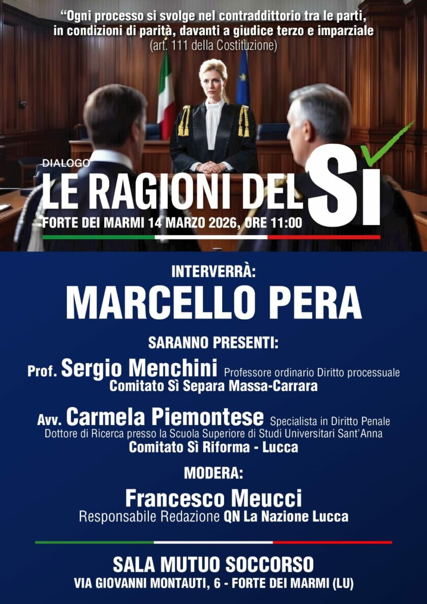 Sabato 14 marzo 2026 alle ore 11 a Forte dei Marmi, presso Sala Mutuo Soccorso, via Giovanni Montauti, si terrà il “Dialogo, le Ragioni del Sì” con il Sen. Marcello Pera.