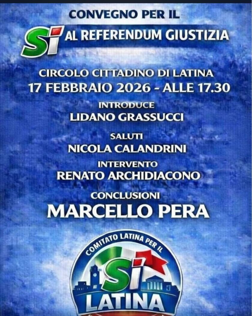 Oggi, martedì 17 febbraio 2026, alle ore 17:30 presso il circolo cittadino di Latina si terrà il convegno per il Si al Referendum sulla riforma della Giustizia del 22 e 23 Marzo 2026.