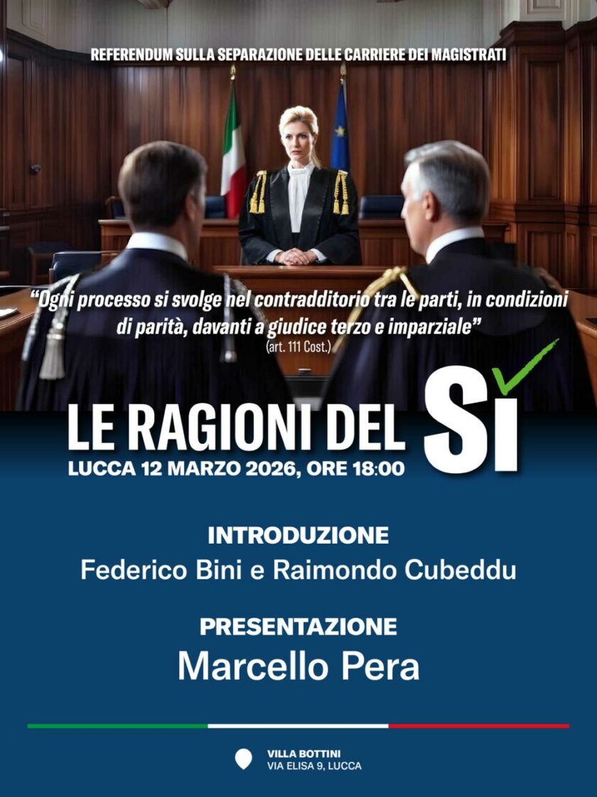 Eventi Lucca – Dialogo, le Ragioni del Sì Oggi 12 marzo 2026 alle ore 18 a Lucca, presso Villa Bottini, via Elisa, 9, si terrà il “Dialogo, le Ragioni del Sì” con il Sen. Marcello Pera. Please follow and like us: