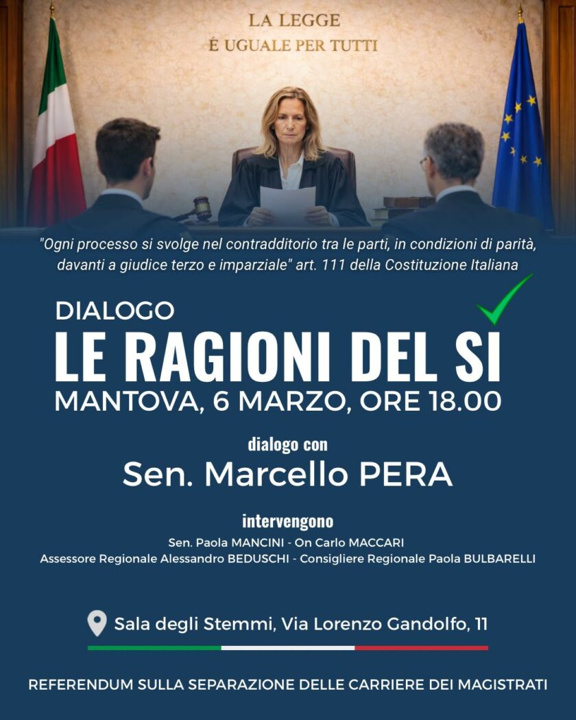 Il 06 marzo alle ore 18 a Mantova, presso la sala degli Stemmi, Via Lorenzo Gandolfo, 11, si terrà il “Dialogo, le Ragioni del Sì” con il Sen. Marcello Pera.