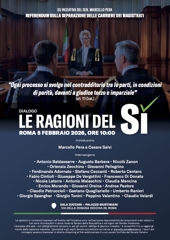 Giovedì 5 febbraio 2026 alle ore 10:00 presso la Sala Zuccari di Palazzo Giustiniani, Via Dogana Vecchia, 29, Roma, su iniziativa del Sen. Marcello Pera si terrà il Dialogo – Le Ragioni del Si – per il Referendum sulla separazione delle carriere dei magistrati del 22-23 marzo 2026.